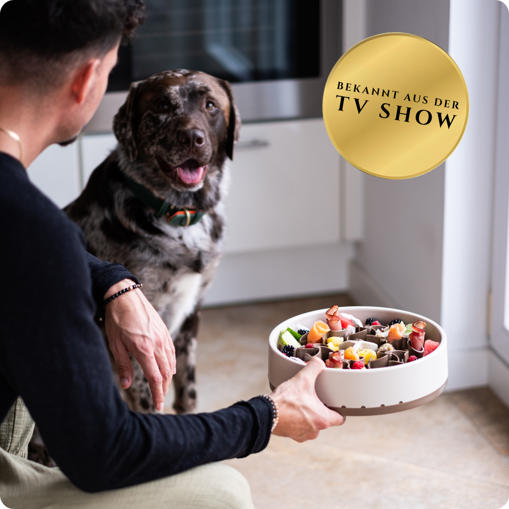 Davids Weimaraner Hunter schlang sein Futter so schnell, dass es ständig zu Verdauungsproblemen kam. Kein Anti-Schling-Napf half, Hunter durchschaute jedes Muster. Also haben wir selbst einen entwickelt, der sich jeden Tag verändert.